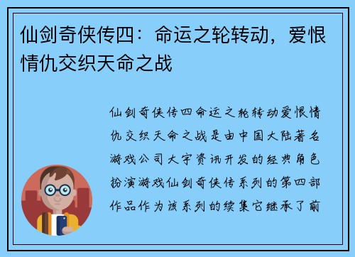 仙剑奇侠传四:命运之轮转动,爱恨情仇交织天命之战
